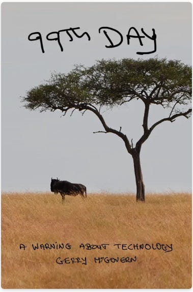 In 99th Day, with refreshing honesty, Gerry McGovern names his part in our techno-sphere’s mess; and then he reports the worldwide consequences of digitalized society. McGovern calls his book a warning. For writing it, we owe him hearty thanks.